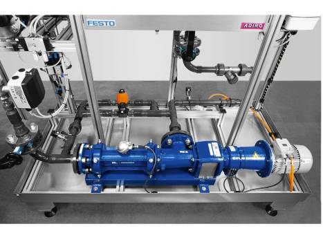 Pumps are the heart of process systems. The station has a progressive cavity pump with overheating protection, a 400 AC geared motor, a 120 liter stainless steel water basin, a stainless steel drip tray the size of the entire system frame, a piping system with manual valves for fault simulation, pressure/vacuum sensors on the pressure and suction side, a bypass line with adjustable safety valve. A pneumatically actuated slide valve and a butterfly valve are connected to a compressed air reservoir as an energy buffer for emergency operation. The pump is accessible for recovery with a workshop crane. Includes logbooks for lockout-tagout training. Sturdy aluminum frame with adjustable feet for leveling on uneven floors. Suitable for transport with pallet truck.