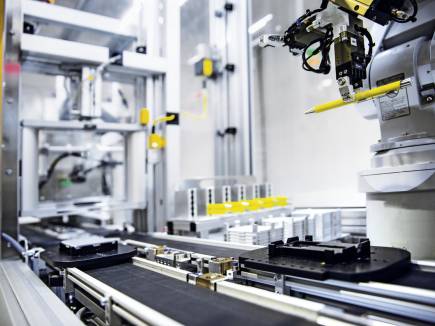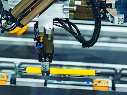 Als „Giveaway“ werden auf der Anlage Kugelschreiber und Visitenkartenboxen per Trumpf Lasertechnik mit dem Besuchernamen beschriftet. Das Handling der Teile erfolgt mit einer Kombination aus Festo Linearachsen und Pilz Antriebstechnik. Ein 6 Achs-Vertikalknickarmroboter von Mitsubishi ist ebenfalls integraler Bestandteil der Anlage.