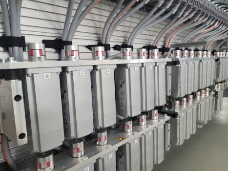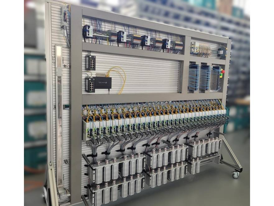 Das Motoren-Testrack dient zum gleichzeitigen Betrieb von bis zu 32 dynamische bürstenlose permanenterregte Synchronservomotoren plus einer Linearachse, angetrieben mit einem Schrittmotor und Zahnriementrieb.