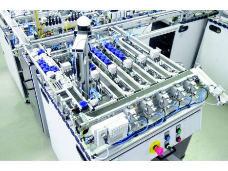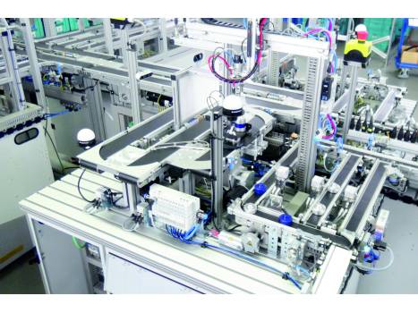 Die Modellfabrik bildet einen Fertigungsprozess ab, in dem Rohmaterialien (Werkstücke) in Form von unterschiedlichen Metallkegeln verarbeitet werden.