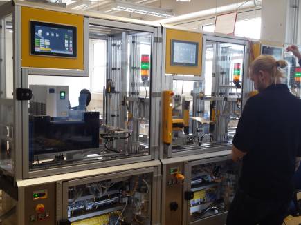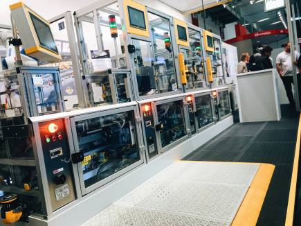 Als „Giveaway“ werden auf der Anlage Kugelschreiber und Visitenkartenboxen per Trumpf Lasertechnik mit dem Besuchernamen beschriftet. Das Handling der Teile erfolgt mit einer Kombination aus Festo Linearachsen und Pilz Antriebstechnik. Ein 6 Achs-Vertikalknickarmroboter von Mitsubishi ist ebenfalls integraler Bestandteil der Anlage.